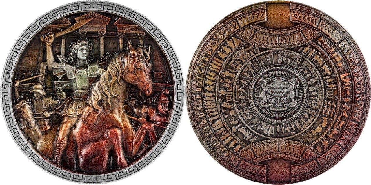 Александр Великий с конем Буцефалом, Чад, 155.5 гр. серебра с медью, вогнутая, античный стиль, тираж 199 шт.