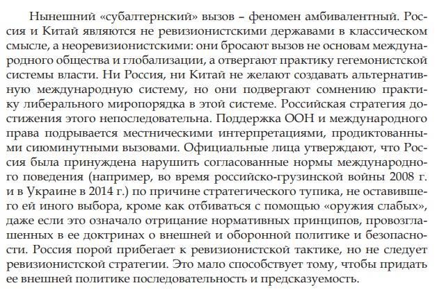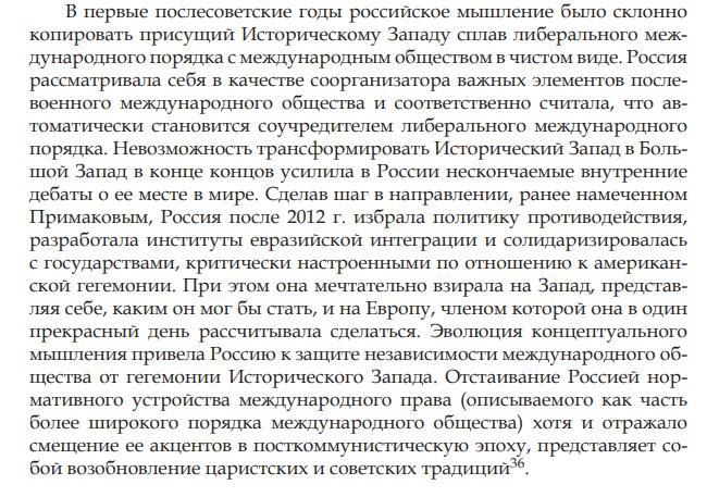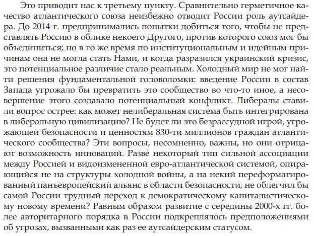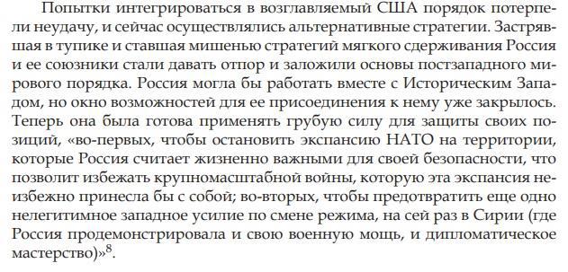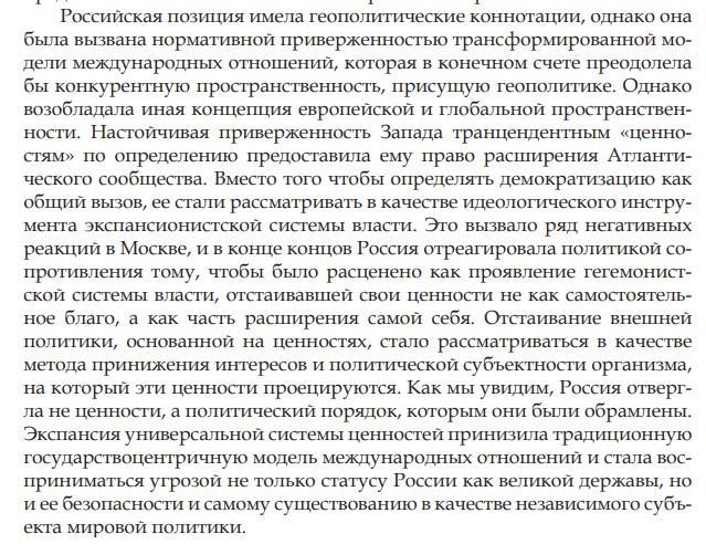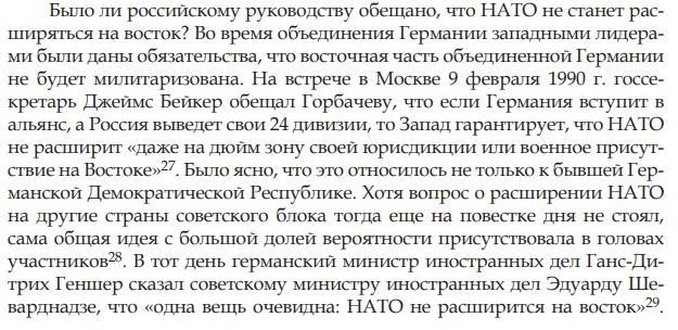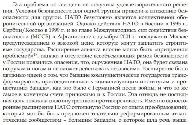 Также автор обращает внимание на тот факт, что расширение НАТО на восток в России воспринимался крайне болезненно, а откровенно лицемерная позиция «Исторического Запада» не могла не вызвать противодействия.