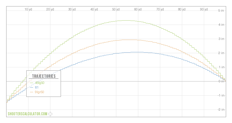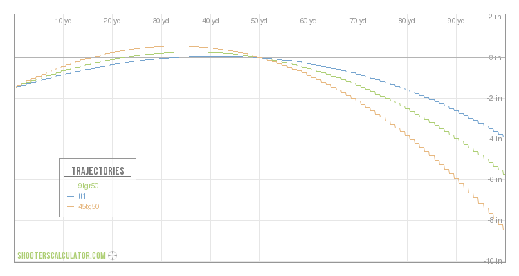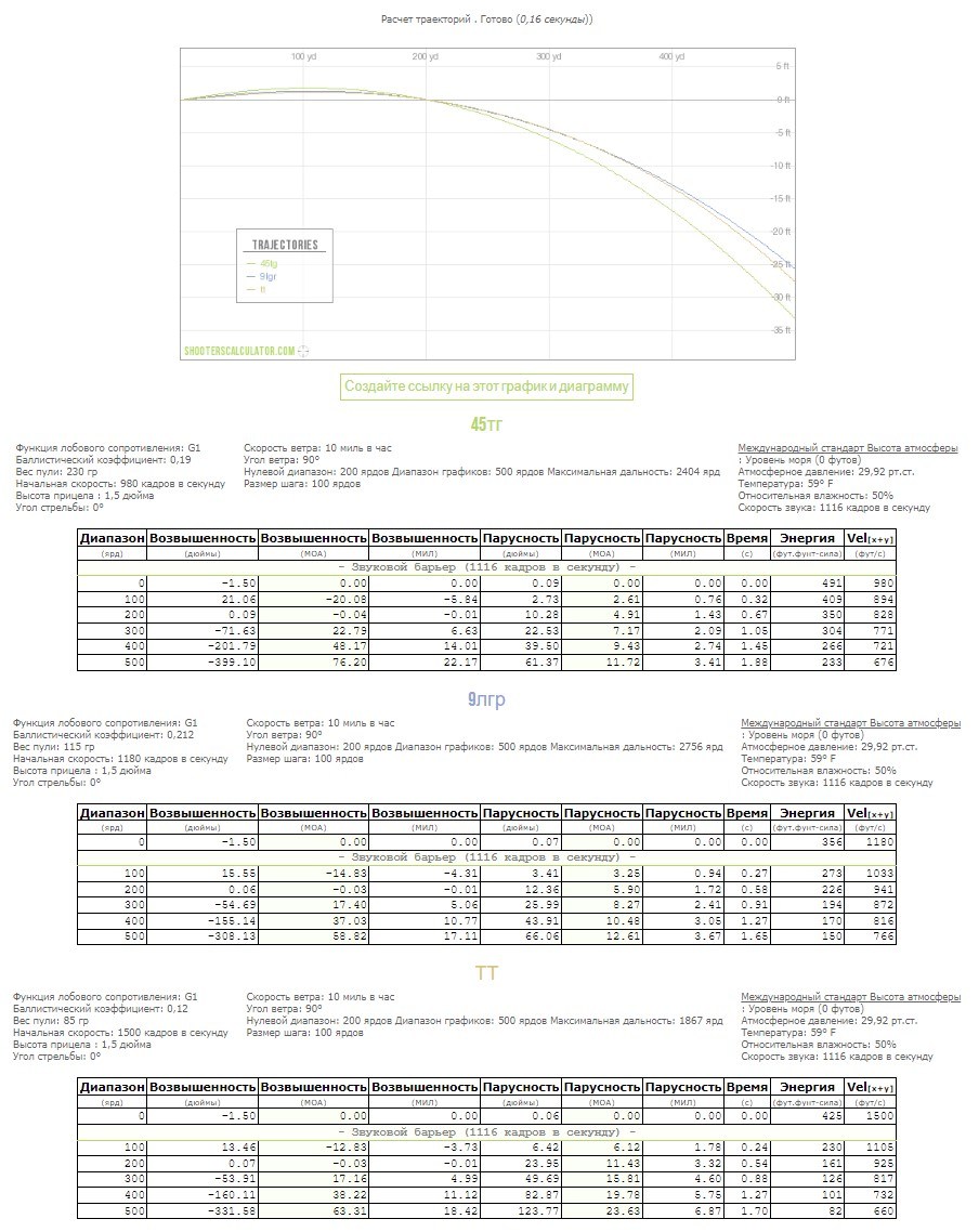 Понятно, что на полкилометра из ПП стрелять дюже оптимистично, поэтому более подробно посмотрим на баллистику на дистанции 100 м для ПП приведенному к нормальному бою (нулю) на дистанции 50 метров (ярдов, поскольку у меня калькулятор буржуйский и мне лень искать метровый.