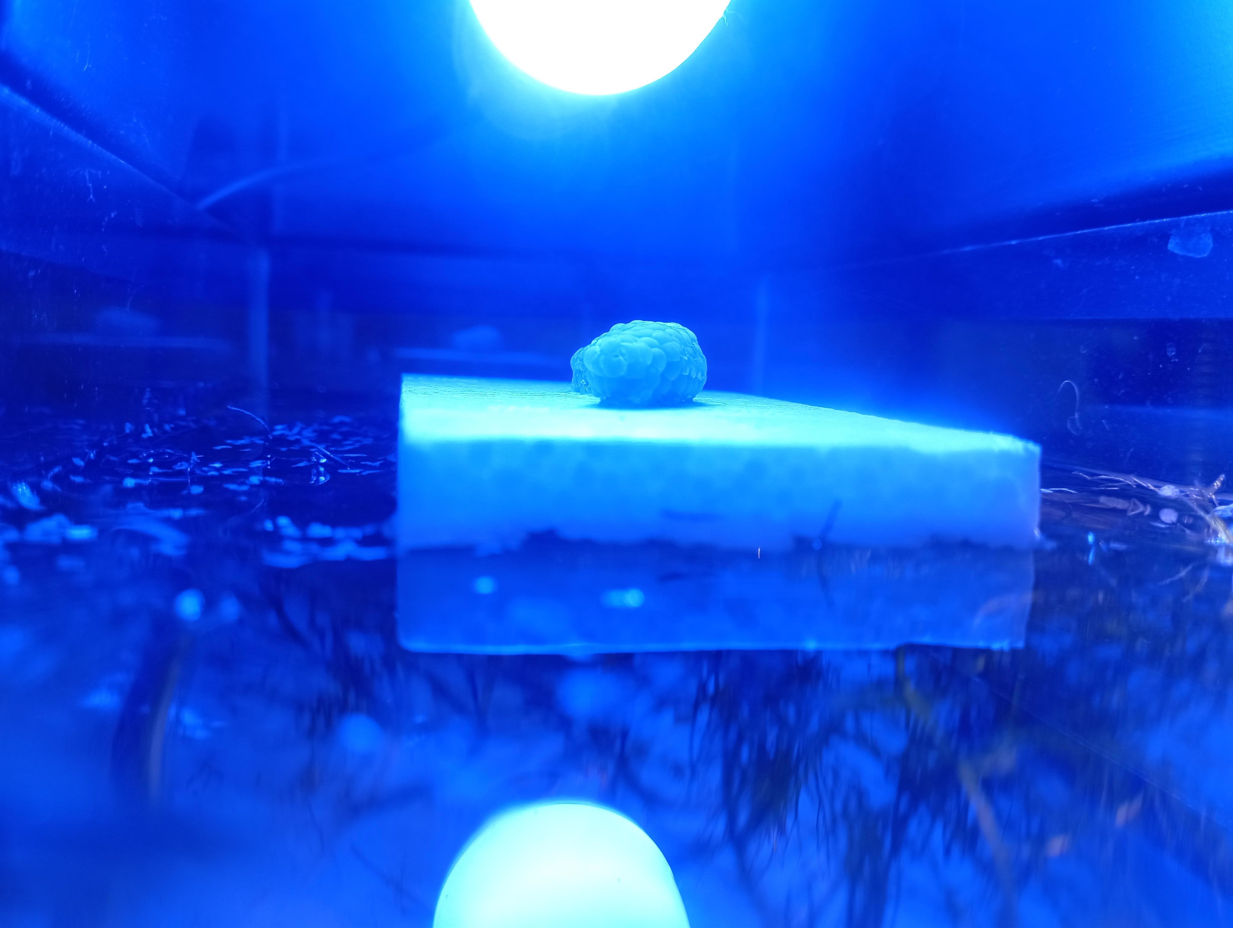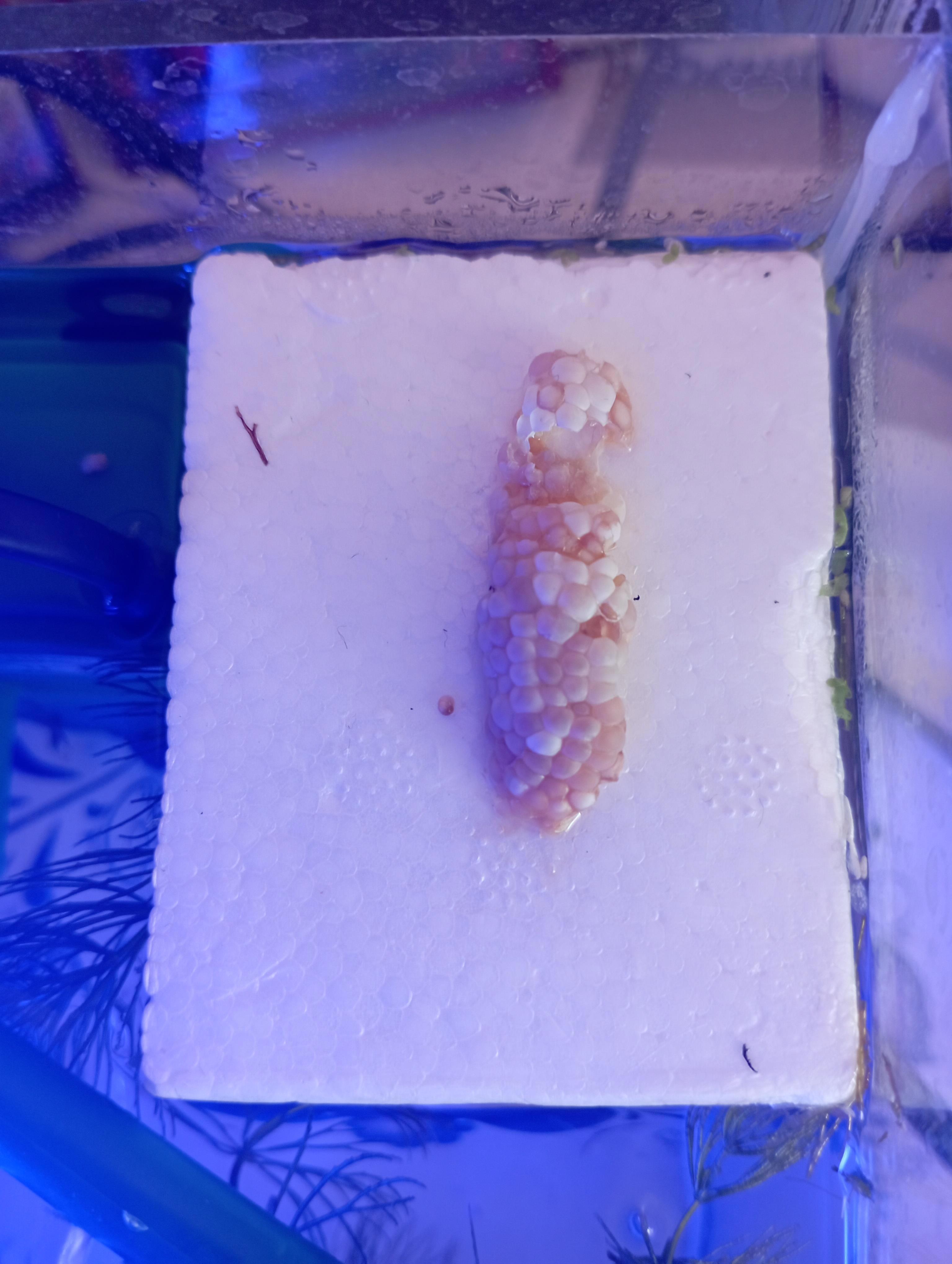 А ровно через неделю после первой кладки на крышке аквариума мы нашли вторую гроздь! Пришлось бегом нестись в аквариумный магазин, покупать ещё один маленький аквариум, с прицелом, что малыши будут подрастать там отдельно от родителей, и класть новую икру туда. Благо, пенопласт для плотика ещё оставался. Вот так выглядит плотик со свежей икрой.