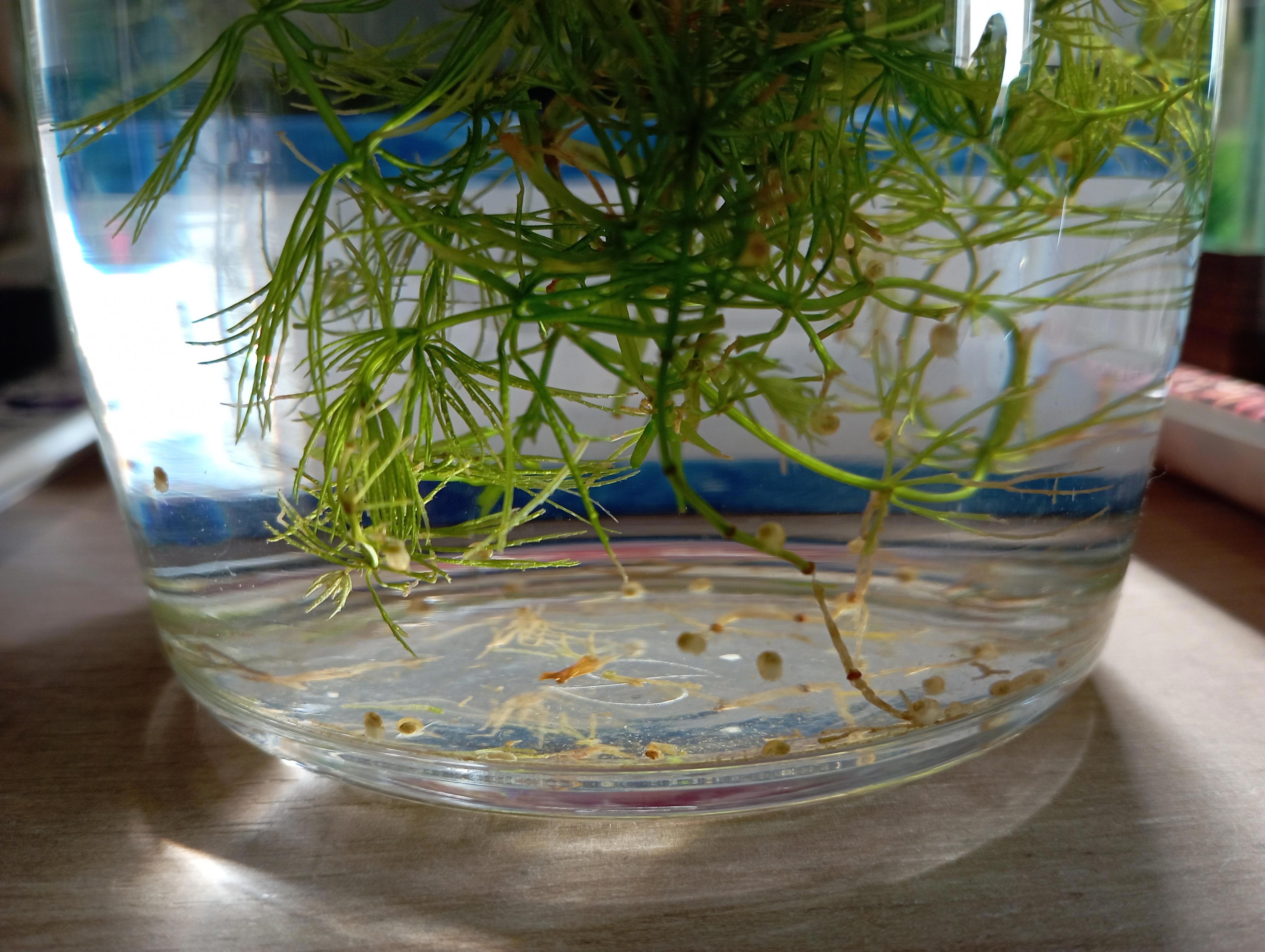 Несколько дней нововылупившиеся улитки почти не двигались и были очень медленными. Я даже не понимала, они живы или нет. Но через 2-3 дня они стали более активными, стали выползать на стекло и передвигаться по самой банке. Многие улитята поселились в веточке роголистника. Удобно, и укрытие, и еда.