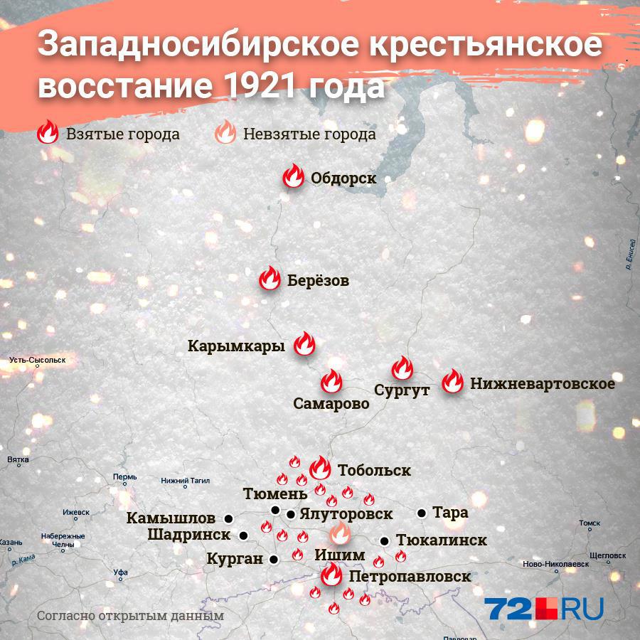 Настроения сибирского крестьянства были схожи с настроениями крестьян Екатеринославщины, Тамбовщины, других регионов России. В волостях, захваченных повстанцами, создавались беспартийные и свободно избираемые волостные советы. Достаточно быстро восставшим удалось захватить не только села, но и целые города, в том числе Петропавловск, Тобольск, Кокчетав, Сургут, Обдорск (ныне – Салехард), Березов и Каркаралинск.