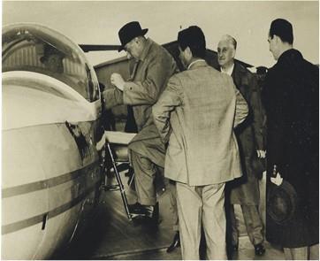 Энрико Маттеи садится в самолёт. Пилот Ирнерио Бертуцци (в светлом костюме) стоит спиной к фотографу.