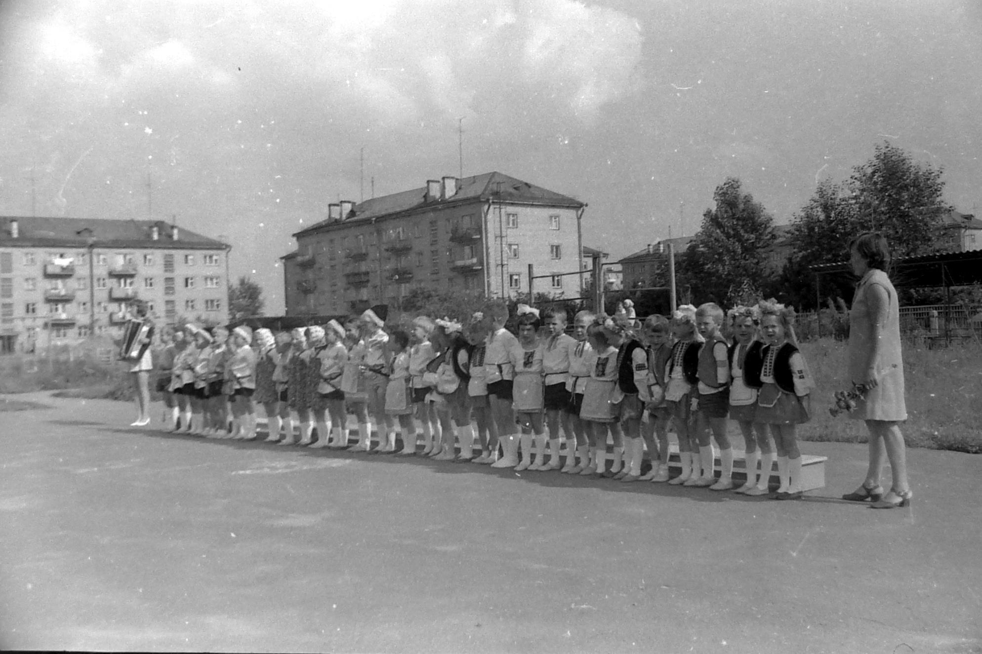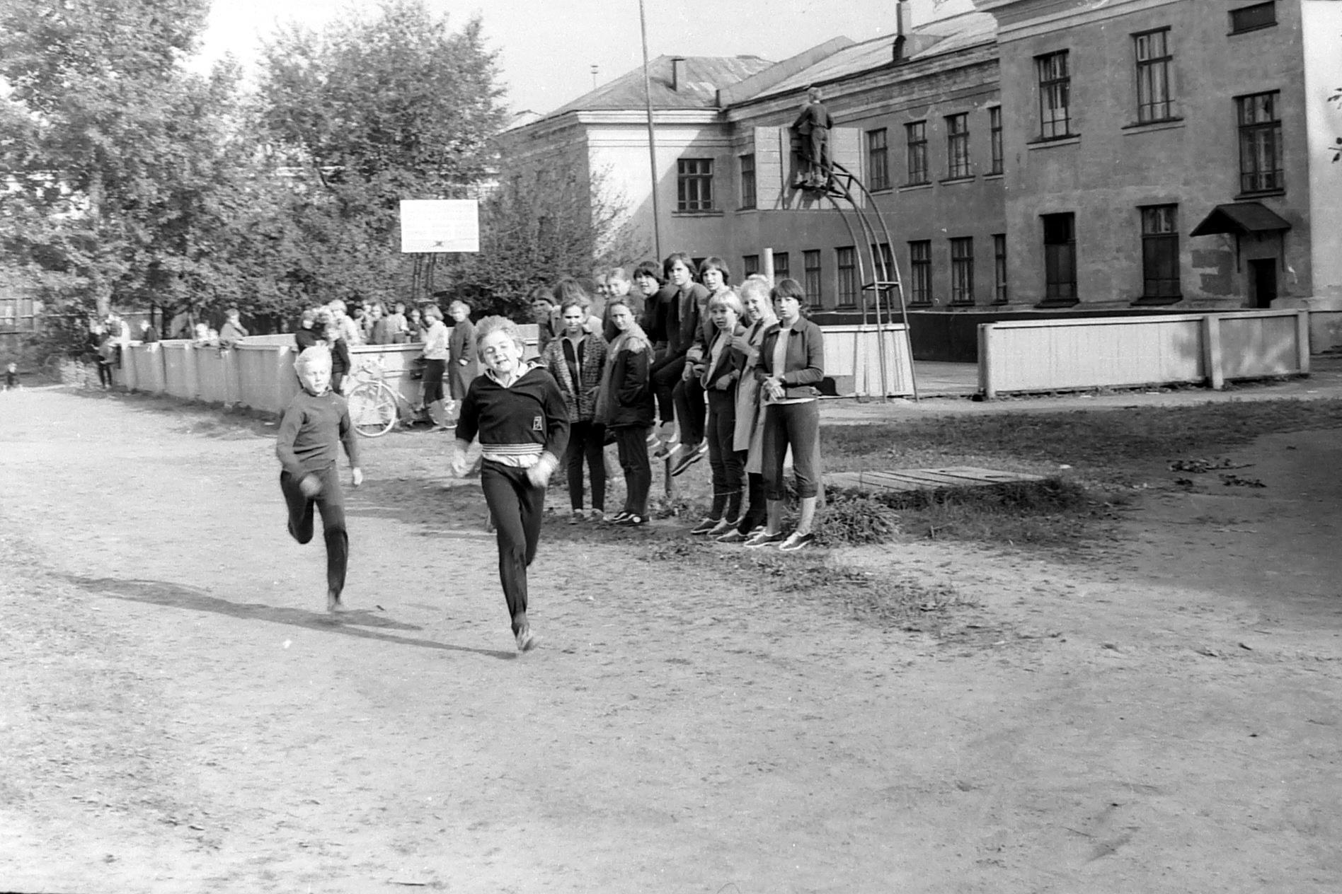 Занятия физкультурой в школьном дворе, 1970-е (школа - та самая, где в войну исполнили впервые "Синий платочек"):