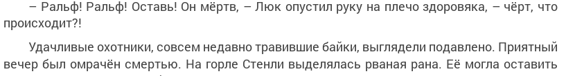 Далее ГГ раскрывается, произнося мысленную речь. Да это раскрывает его мотив, но форма этого раскрытия меня немного огорчает, ибо немного пафосно и "око за око" (сначала образно после разговора с Ральфом, потом, в диалоге с мужикм за дверью, явно. Многовато.). Кроме того, тема приравнивания жизни койтов (которых читатель не знает) к жизни людей (которых читатель успел узнать, а особенно Мигеля), весьма удивляет. Но да, это играет на тему странности ГГ.