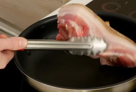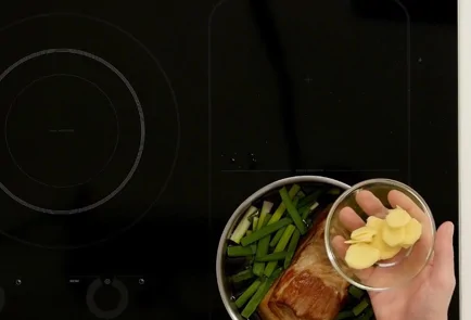 1) Грудинку обсушить от влаги и обжарить на растительном масле со всех сторон до золотистой корочки. Затем в кастрюлю влить 250 мл воды, 80 мл соевого соуса, рисовое вино, добавить 2 столовые ложки сахара, довести до кипения и поместить туда мясо, крупно нарезанные зеленый лук и имбирь. Готовить на низком огне под крышкой в течение часа. Периодически поливать мясо соусом.