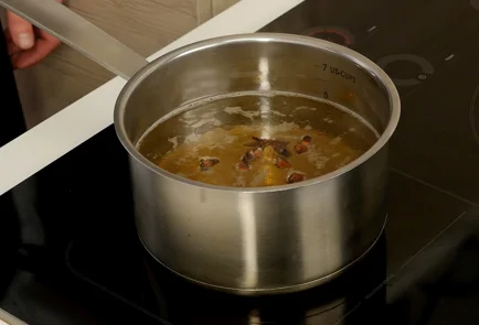 2) Разогреть бульон, добавить крупно нарезанный имбирь, зубчики чеснока и анис, поварить 30 минут.