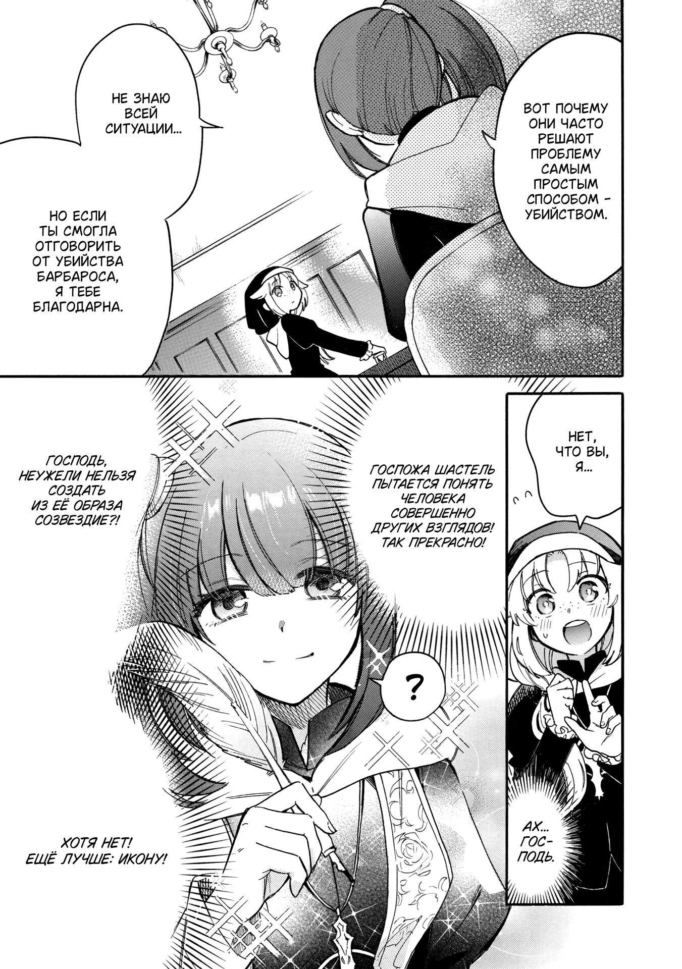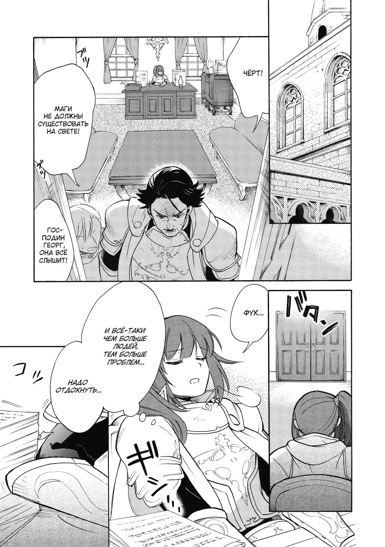 В основной манге, как мы помним, былая такая героиня, как Дева Святого Меча Шастель - носительница волшебного клинка, которой положено гонять магов во имя церкви, но которая оказалась благочестивой, верующей и благородной в хорошем смысле этого слова. так что даже к магам относилась справедливо, и в итоге чуть не вылетела со службы за это, однако смогла удержаться на посту и наладить улучшение отношений между храмовниками и колдунами. Ну а чтоб девушку не прихлопнули коллеги, протагонист приставил к ней своего приятеля, мага тени Барбароса.
