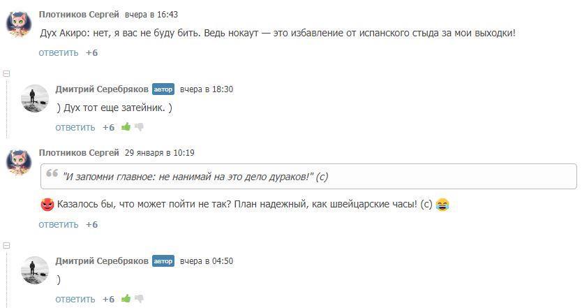 Иногда писатель начинает активно отвечать — тогда я не стесняюсь и в личку спросить, угадал ли что-нибудь из глобальных ходов. Или даже предложить какие-то мелочи, которые не меняя повествование могут (по моему мнению) лучше раскрыть сюжет. До некоторых пор мне это сходило с рук. В прошедшем времени, ага.