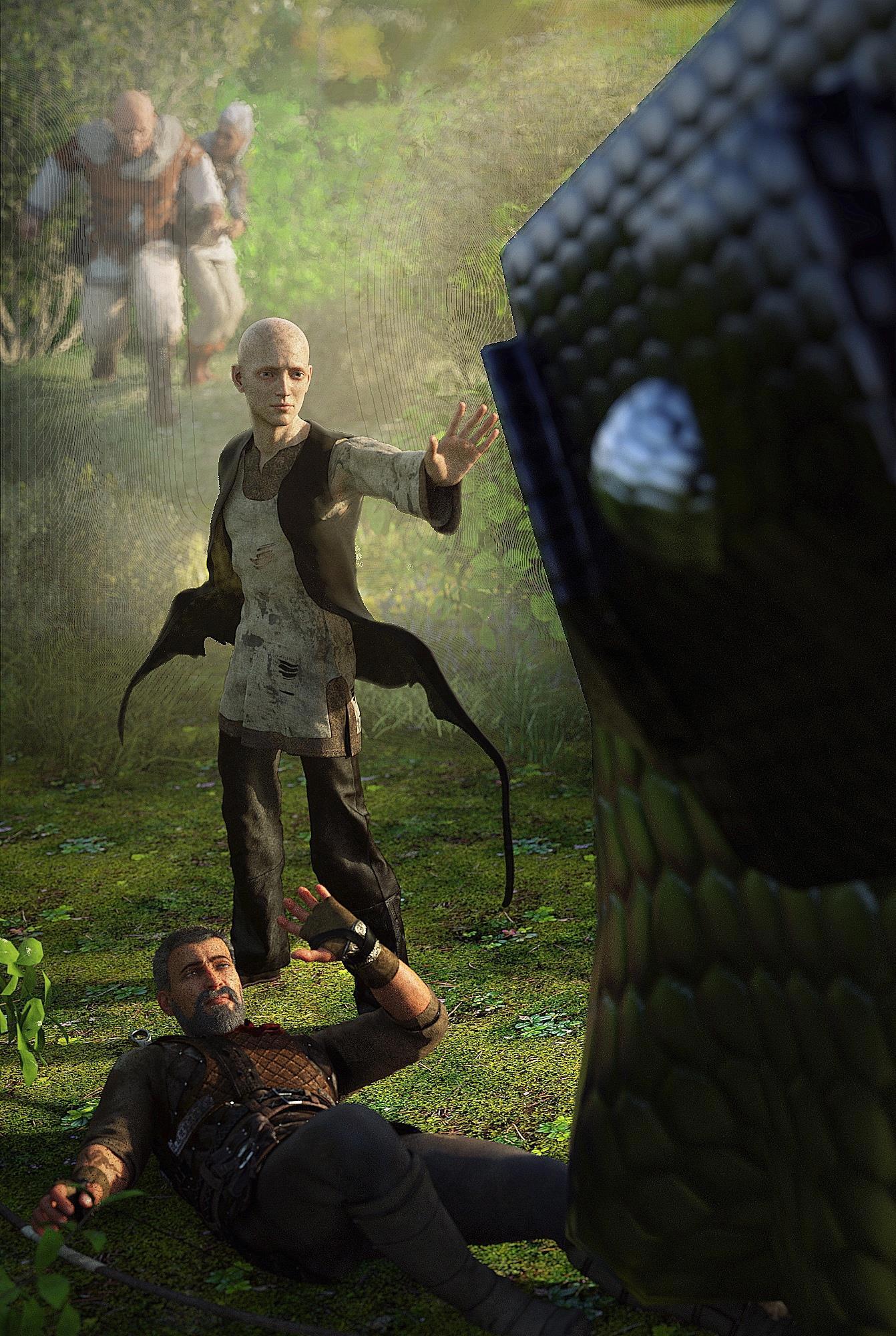 Для описываемого мира он ещё один чужак, иноземец. Прибыл в Самру, чтобы забрать из рабства своего пожилого отца, отбывшего срок неволи. Но вместо этого попал сам в заваруху. Взял местного воина себе в рабы, влюбился в местную женщину, взял обязательства, наделал долгов... В общем, просто так скататься в чужую землю и пожить в пятизвёздочном отеле ему не удалось - уж больно человек оказался жалостливый.