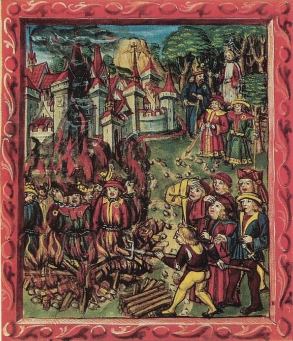 Картинки: Нью-Йоркский бык; Сожжение иудеев в Аугсбурге в 1348 г; Сожжение на медленном огне Якоба Рорбаха в 1525г.