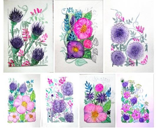 Результат этих трёх июльских недель - две серии по семь открыток. В конце подготовительной недели мы должны были сразу определиться сколько серий открыток должны получиться к финишу - одну или две. Я определилась, что буду рисовать 2 серии. Одну с шиповником, вторую с полевыми цветами. Получилось, что и в первой серии не все были с шиповником, и во второй тоже. Полевые цветы тоже присутствуют и там, и там. Главным отличием второй серии, которую я начала в последней недели марафона, стала цветовая гамма. В первой серии я взяла 3 цвета - розовый, жёлтый, голубой, а во второй главными стали розовый и фиолетовый. К нему добавлялся зелёный и желтый. В этой серии я сразу решила использовать не только акварель, но и графику. Первая открытка этой серии была с чертополохом и я поняла, что стоит к черному линеру добавить серебряную гелиевую ручку.