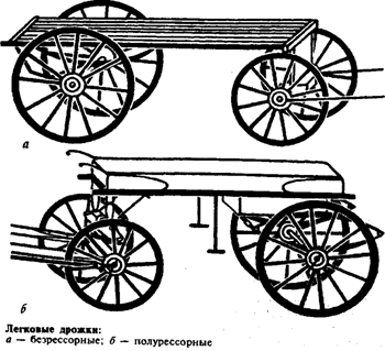 Дрожки получили свое название от дрог – длинных брусьев, соединяющих обе оси. Первоначально это была совсем примитивная повозка: на доску, положенную сверху, приходилось садиться верхом или боком. Подобного рода дрожки иногда называли трясучками. Позднее дрожки усовершенствовались, обрели рессоры и кузов. Такие дрожки иногда получали название коляски, по сходству. Но ни старые, ни более совершенные дрожки для езды на особо длинные расстояния не использовались. Это был преимущественно городской экипаж.