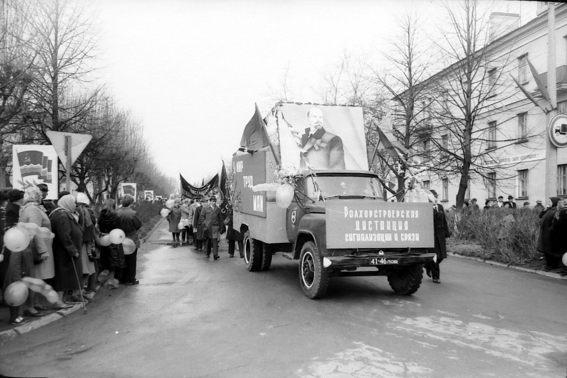 1982, первомайская демонстрация. Если бы фотограф сделал снимок секунд на 10-15 позже - в кадр вполне мог бы попасть я ;)