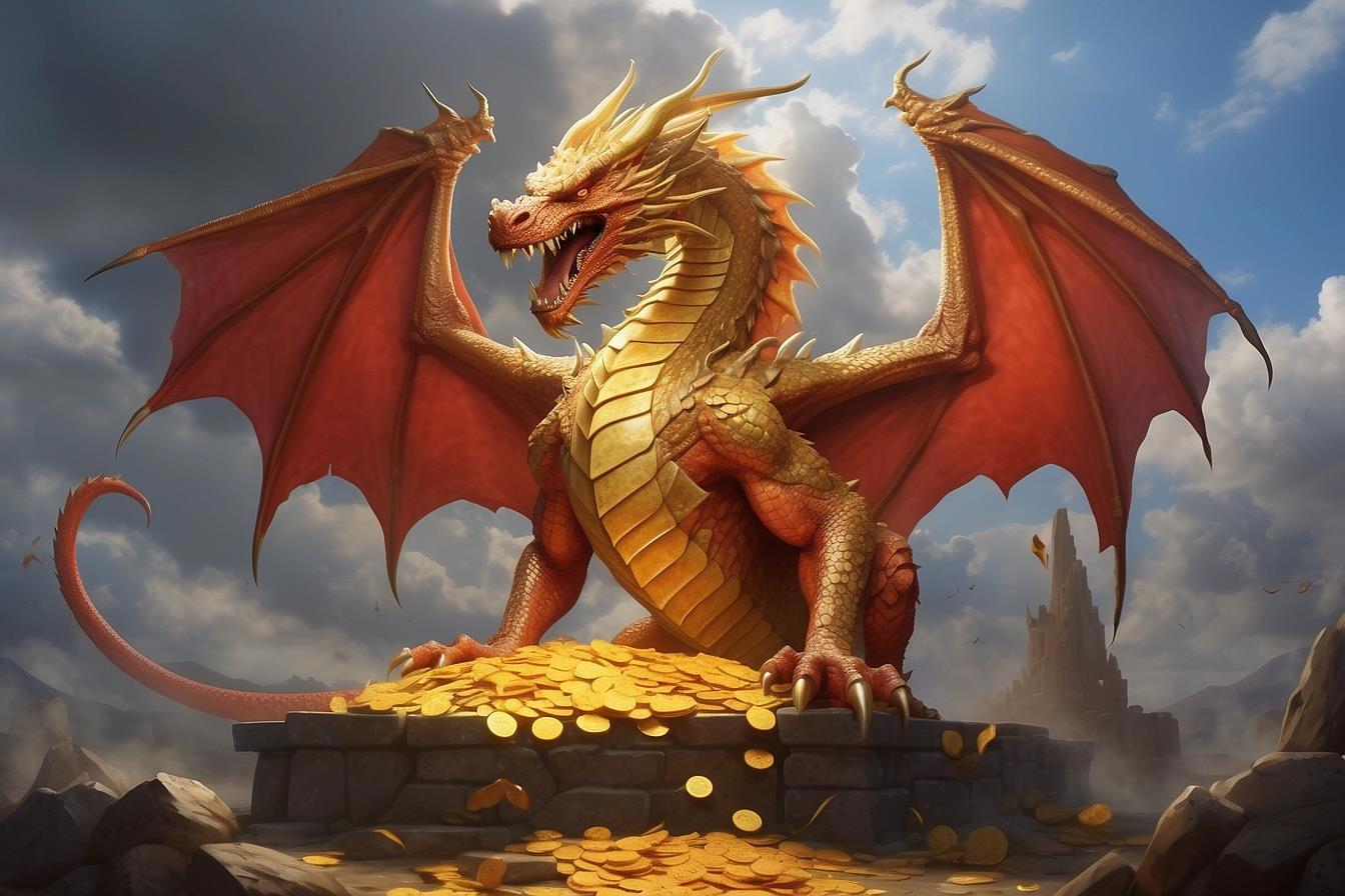 Promt: "The image was cheerful, bright and catchy: a huge red dragon on its hind legs, spewing clouds of plasma, attracted attention, and from insignificant nonsense, a fairly crumpled lump of paper became something more. The sight of a fire-breathing reptile inspired involuntary respect, and the flame seemed about to set fire to the paper. I am sure that his menacing, as if frozen, gaze was able to scare away anyone who would only want to think about encroaching on his treasures - an immense pile scattered under his mighty paws. In the background of the front side was a majestic tower soaring skyward. It looked like a spire and went into the clouds. Above all this splendor, a luminescent inscription was applied with the name of the divergent world: "Sky-high Coffers". Indeed, if you looked closely, you could see that the Dragon was also on a hill, and clouds were creeping around."