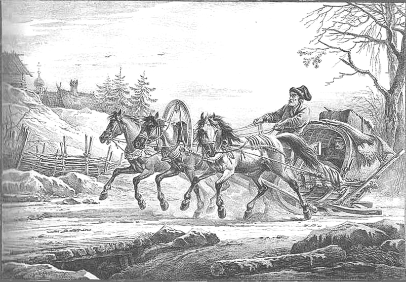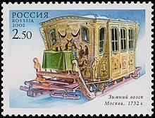 В XVIII столетии для путешествия «высоких особ» употреблялась карета, снятая с колёс и поставленная на полозья.