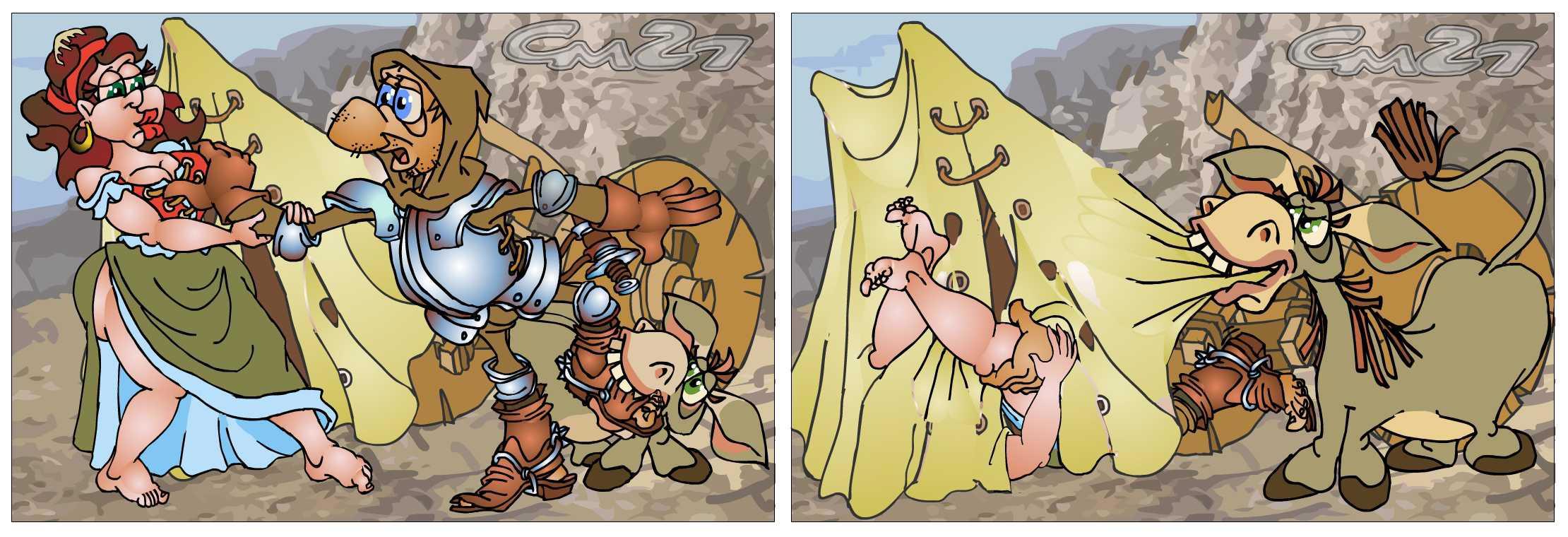 Однако, старая ослица была против! Она крепко держала зубами путника за ногу с другой стороны.Свидание не прошло для нее бесследно.Видимо,рыцарь все же задел какие-то,давно дремавшие,струны ее души,которая уже настроилась на продление сеанса.