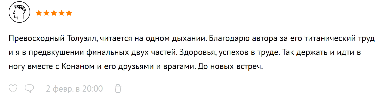 Поэтому не надо заклинать: пиши, пиши... Тем более, не надо за спиной злословить, мол, какой же этот Толуэлл мерзавец - обещал, а всё не пишет (это я тоже увидел в сети). В отличие от былых времён, когда существование писателя зависело от издателя, сейчас оно зависит от самого читателя. Кто хочет, чтобы книги появились - просто дайте понять, что вы - есть, поддержите автора.