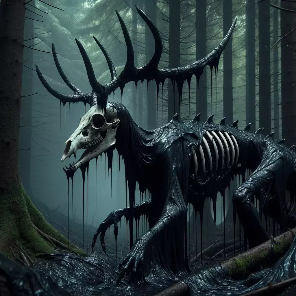 Внезапно из той самой части темной массы, которая удерживала оленя в воздухе, вдруг выросли две ужасающие руки. Они были тонкие, черные, с острыми, как клинки, пальцами, а с их кончиков капала та же черная смола. Одна рука жестко ухватила оленя за задние ноги, другая – за шею, удерживая жертву в неподвижности.