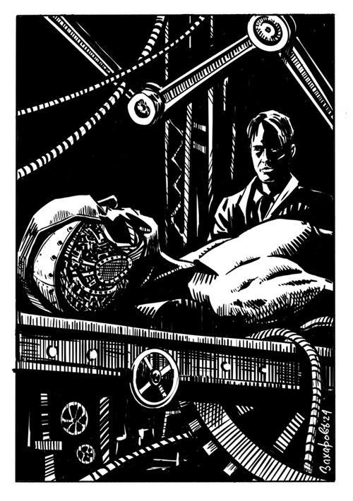Иллюстратор Сергей Захаров продолжает воплощать мои чёрные ретрофутуристические кошмары.
