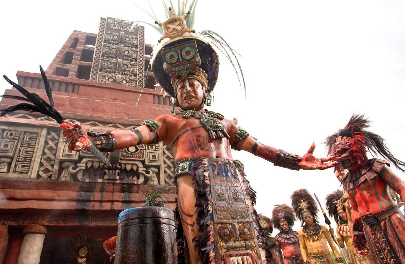 На деревенщину смотрят как на говно, местные ждут аттракционов, власти, следуя «хлеба и зрелищ», одобрительно кидают с одной из пирамид отрубленную башку. Местные орут, визжат, специально обученные пузаны ловят головы ритуально потрясываемым лукошком, всякие девы показывают мезоамериканские моды начала шестнадцатого века и все, кроме сельского быдла в синей краске, довольны.