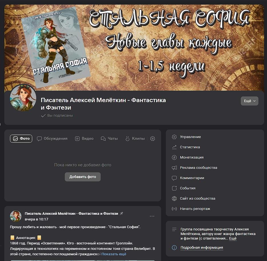 Я создал группу в ВК, в которой будут выходить дополнительные материалы по моему произведению "Стальная София", а так же, в будущем, по другим произведениям. Приглашаю всех заинтересованных присоединиться. К тому же, там будет и толика юмора, для разнообразия :)