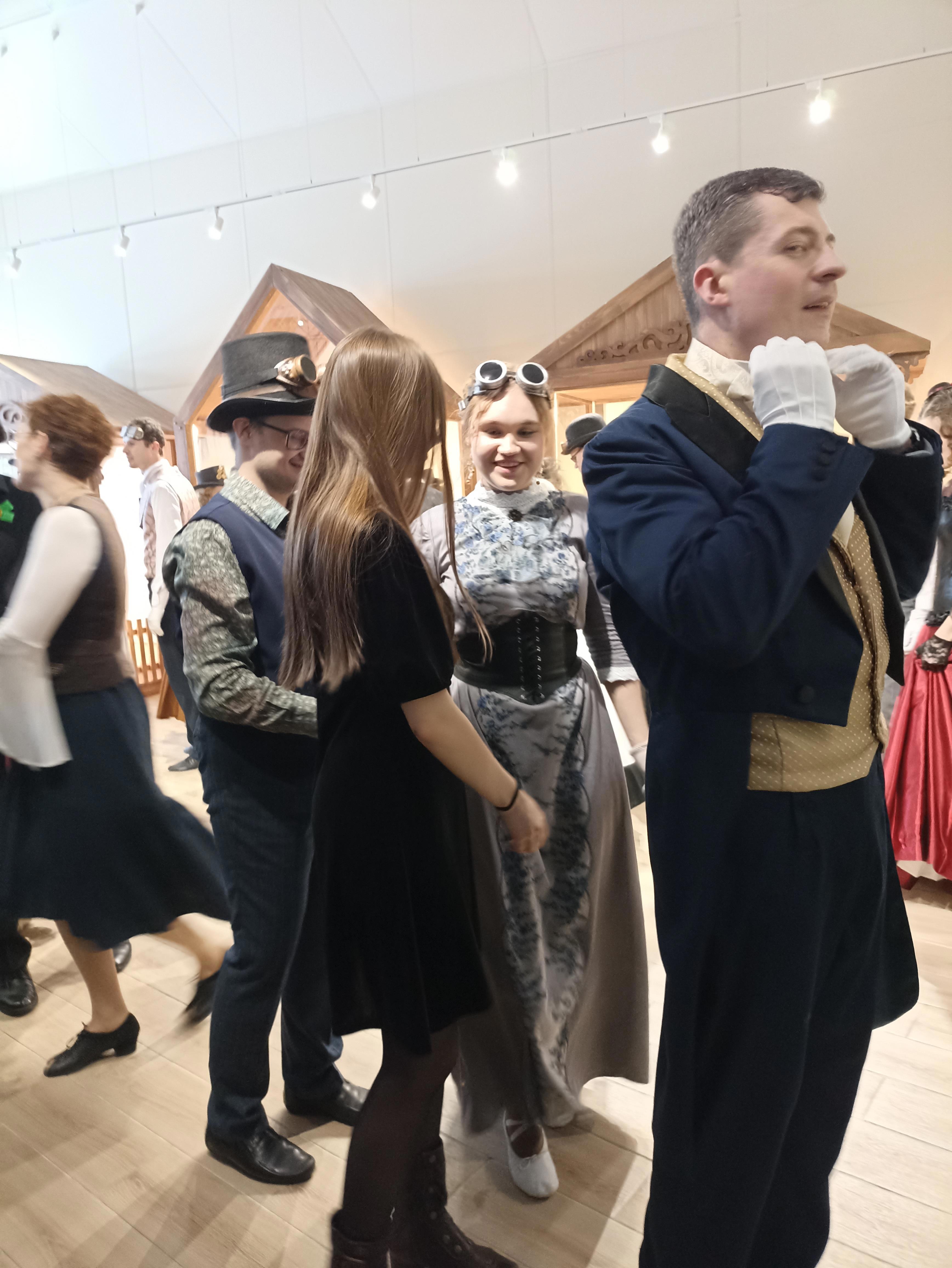 Это было нереально: вот представьте, что вас окружают люди, одетые в стиле прошлого-позапрошлого века, играет какая-нибудь кадриль или полька со звуком шестерёнок и все танцуют так чётко, словно часовой механизм.