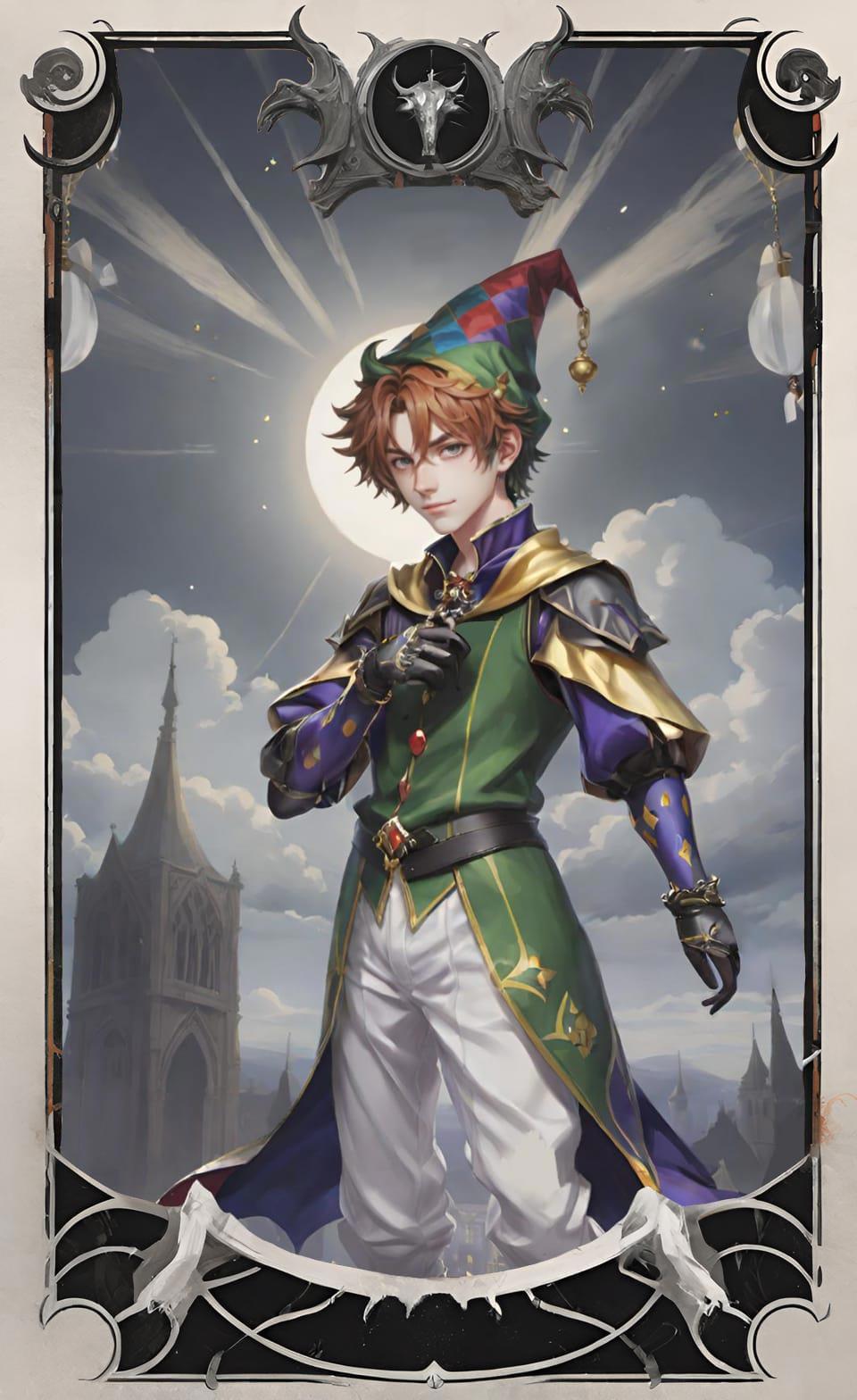 "Мой взгляд упал на картину, которая как будто слабо подсвечивалась изнутри в отличии от остальных. Заинтересованный, я подошел ближе и стал внимательно рассматривать ее. На ней был изображен молодой парень в ярком, цветастом камзоле и с дурацким колпаком на голове, на кончике которого болтался круглый бубенчик. Яркие рыжие волосы торчали во все стороны, создавая образ беспечного человека, но хитрый взгляд серых, стальных глаз говорил совсем о другом. Опустив взгляд вниз, я пытался найти подпись художника, но неожиданно на картине проступила надпись: “Шут”, а затем меня снова накрыла темнота и я проснулся."