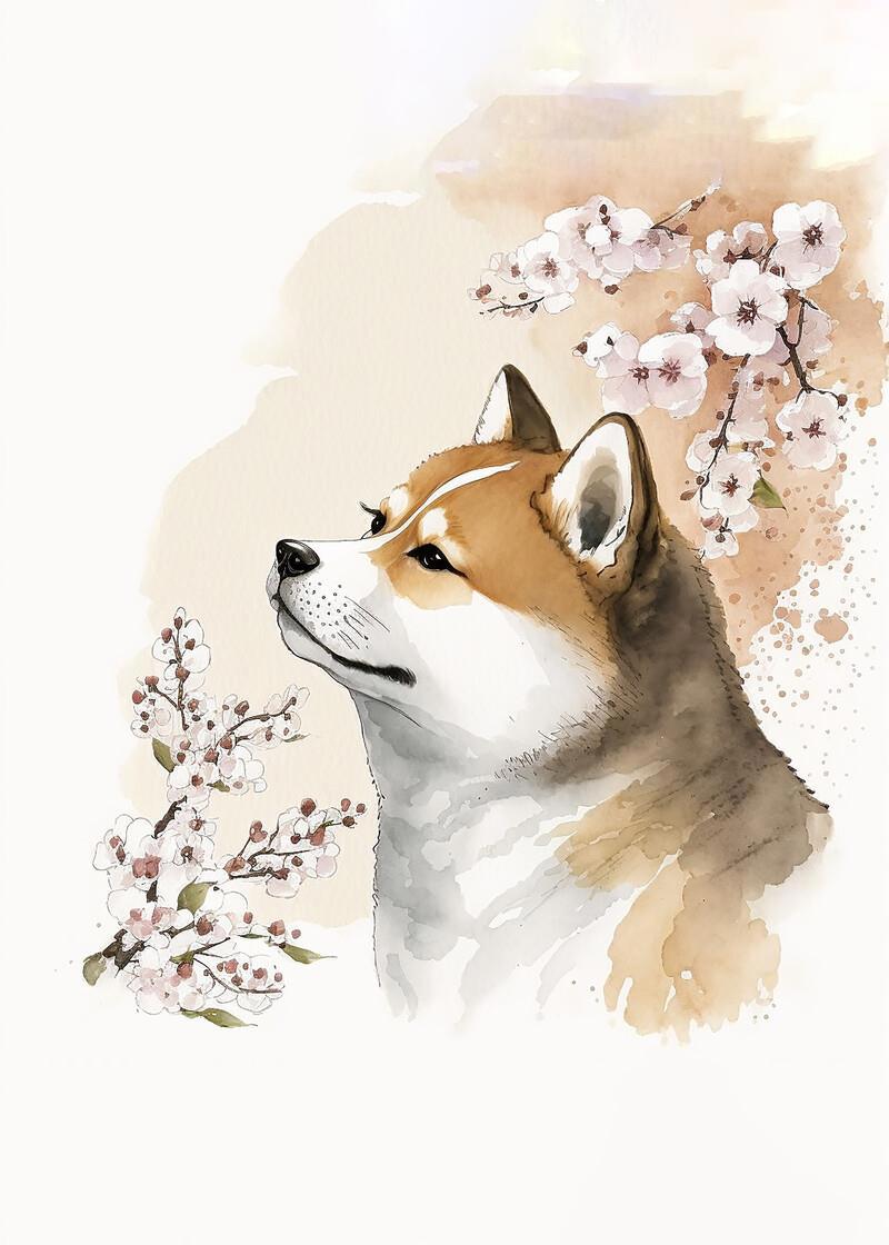Шиба (японская собака-улыбака) в окружении цветущей сакуры, (Maition Design)