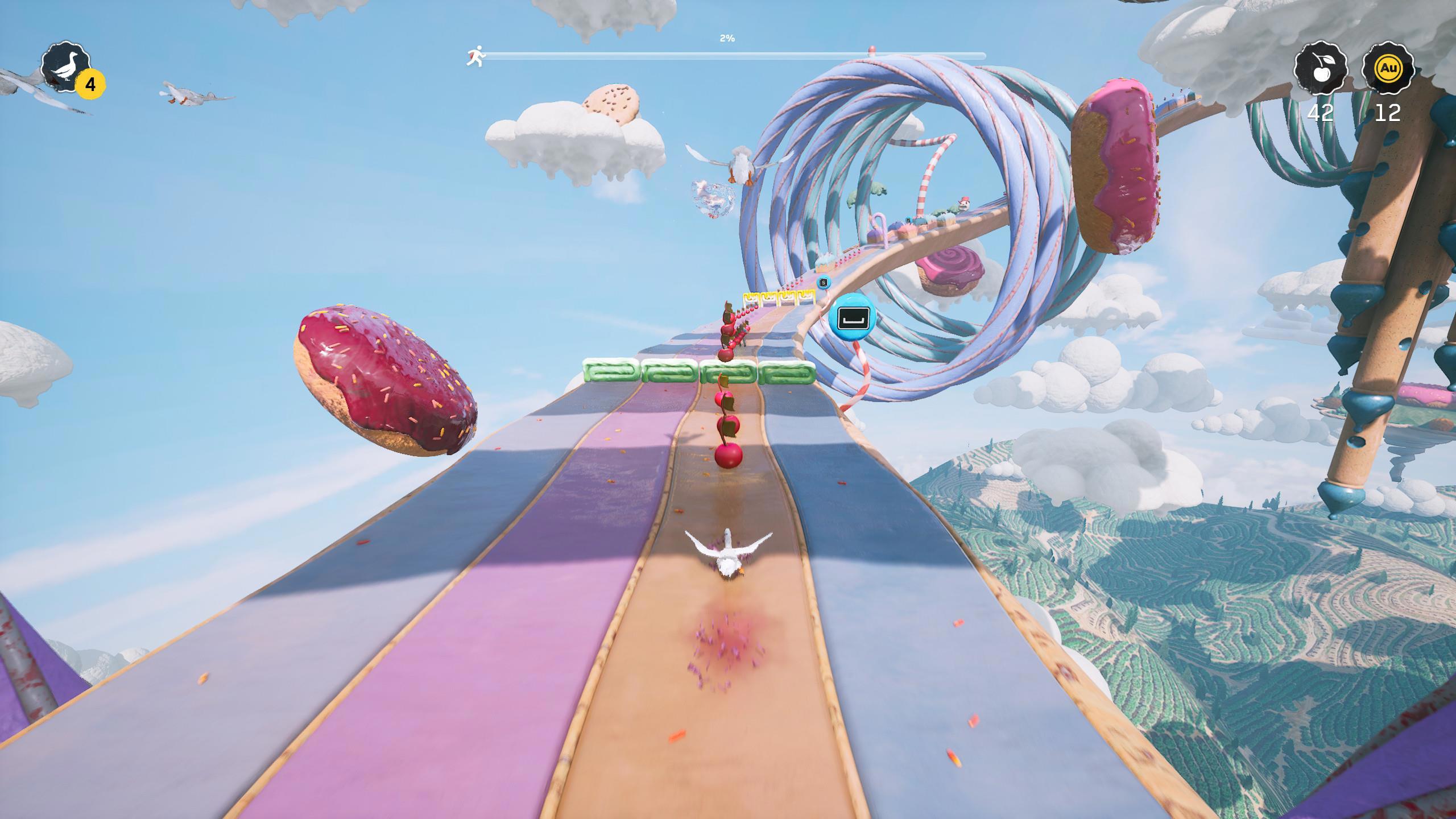 Мы становимся на «трэк» и начинаем катиться вперёд, набирая скорость, подпрыгивая на трамплинах, уклоняясь от угроз, собирая яблоки и золотые монетки. И так – до точки сохранения на какой-нибудь платформе, зависшей в небесах.