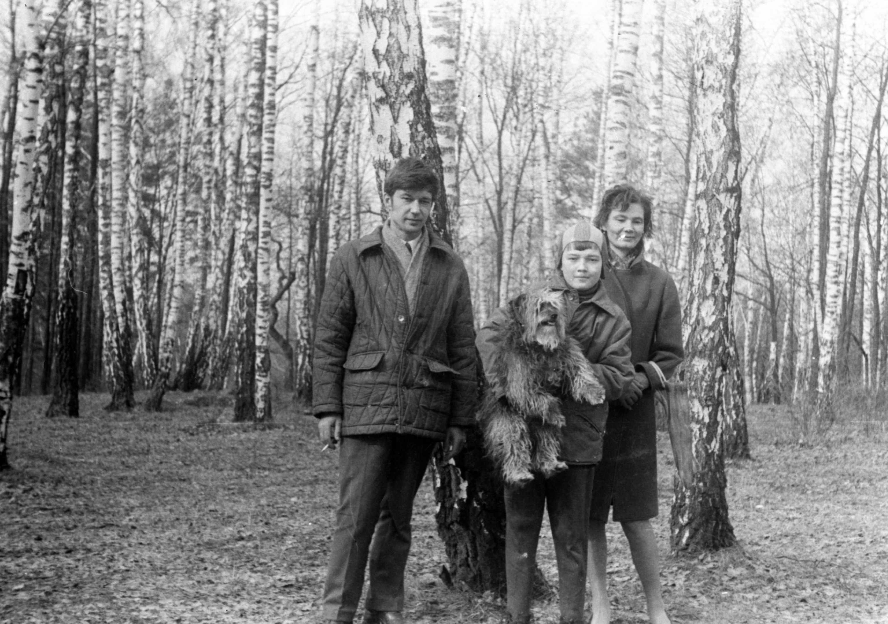 (фото, приблизительно, 1970-го года: слева-направо - отец, наша собака Джильда, я и мама; около реки Протва)