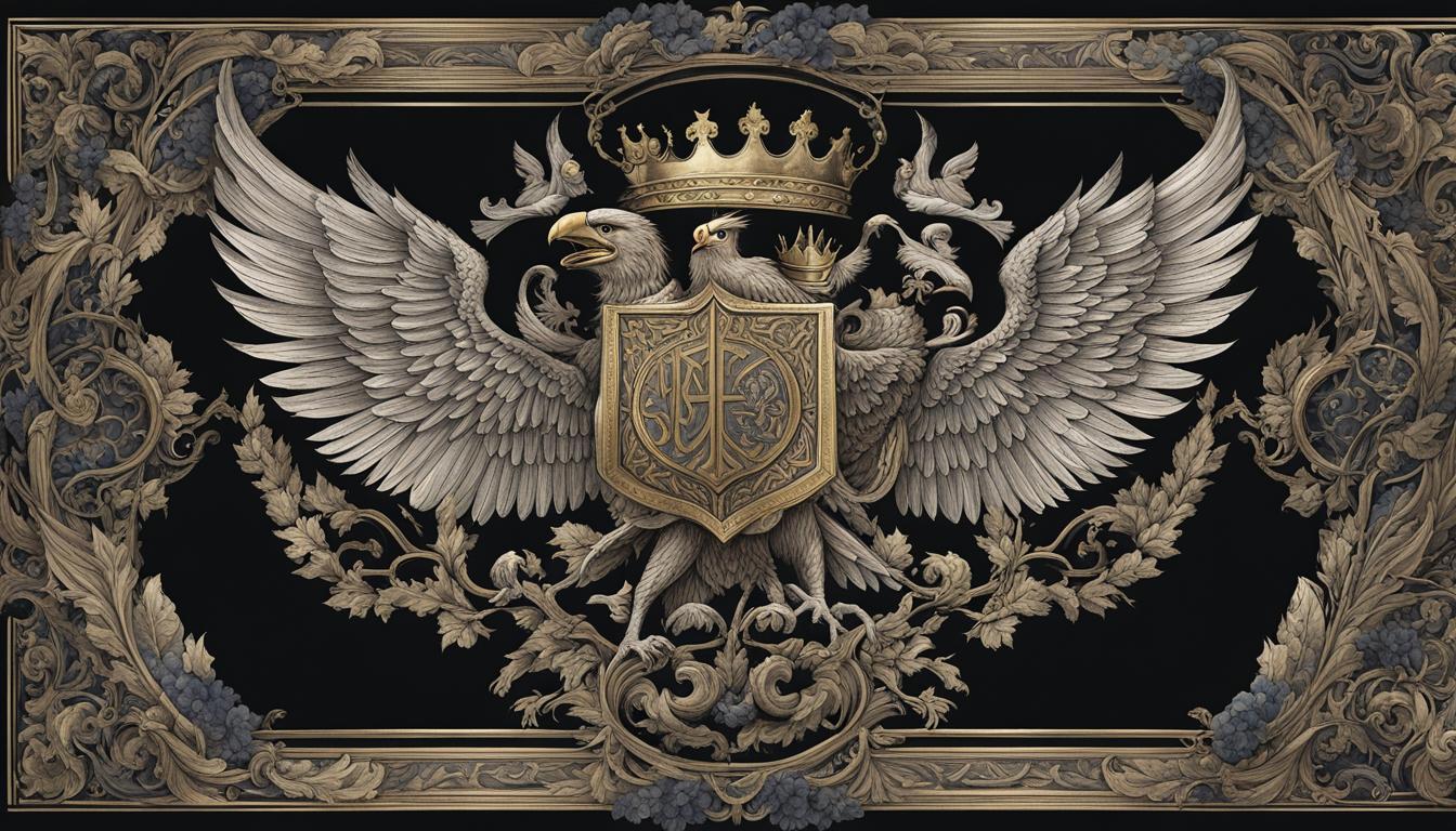 Эмблема с двуглавым орлом и короной на темном фоне символизирует власть и благородство, а величественный зал, где разворачивается театральное представление, напоминает о великолепии искусства драматургии.
