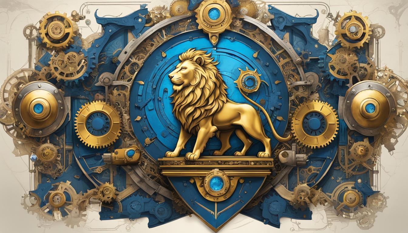 Герб в стиле стимпанк с золотым львом на синем фоне щита, окруженный механическими шестеренками и циферблатами, символизирует смелость и новаторство писателей, стремящихся к футуристическим идеалам в своих произведениях.