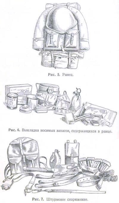 Если запасная патронная сумка, гранатная сумка, и чехол для фляги держатся на самостоятельных плечевых лямках, то они должны надеваться под поясной ремень в следующем порядке: гранатная сумка через правое плечо с левого бока, а патронная запасная сумка и фляга - через левое плечо с правого бока. Запасная патронная сумка должна находиться под поясной патронной сумкой несколько сзади её, а фляга - за запасной патронной сумкой.
