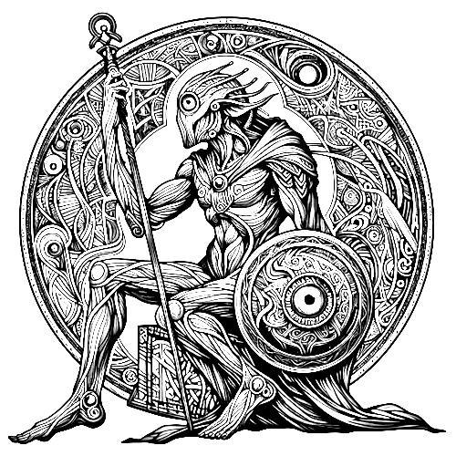 Это рядовой боец той же породы. Как мы помним, у правильного фомора одна рука, одна нога и один глаз, и никаких неудобств это ему не доставляет, потому что гражданин существует одновременно в двух мирах. Оба персонажа получились при прямом прописывании стиля ар-деко. Ни Кандинский, ни Бинг фоморов не знают, если пишешь "с одной конечностью", они тебе их восемь рисуют. Признаться, полностью укомплектованные фоморы были красивее.