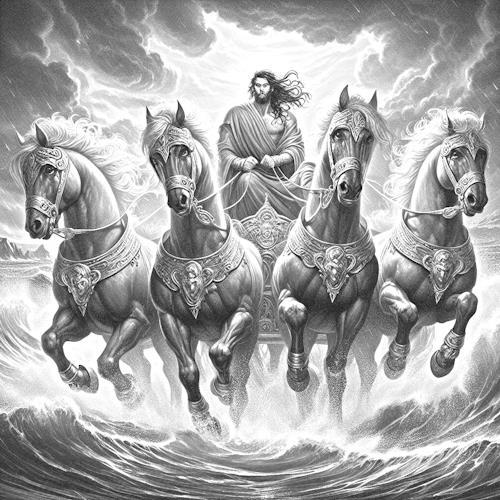Началось все натурально с цирка с конями. Пишешь русским по черному "Четыре волшебных коня везут по морю колесницу морского бога". Получаешь двух очень красивых коней, впряженных в очень красивую золотую колесницу. У коней по восемь ног, и они не копытные. По морю, очевидно, удобнее скакать на крабьих (Карл!) ногах. Но самое замечательное - в колеснице гордо восседает ТРЕТЬЯ ЛОШАДЬ!