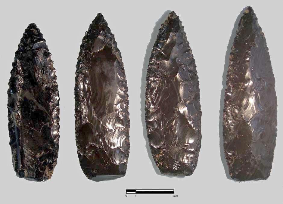 Идём дальше… аналогичные мастерские находили в западной Европе, в Турции, у нас. Но датировка не старше 100 тысяч лет обычно, и там не стекло, а кремень и кости. Я пробовал делать что-то из кремня теми самыми способами. То есть без инструментов. Есть только руки, другие камни, палочки. Довольно канительно, изрезал руки, но в принципе «насобачиться» можно. С костью проще. Приходилось работать и со стеклом. Тоже не заумная вещь, но… если есть инструменты. Без них… ну его нафиг. А древние это делали. Может быть обсидиан по свойствам отличается от обычного стекла? Короче – не знаю, не пробовал. У древних получались вот такие изделия из обсидиана: