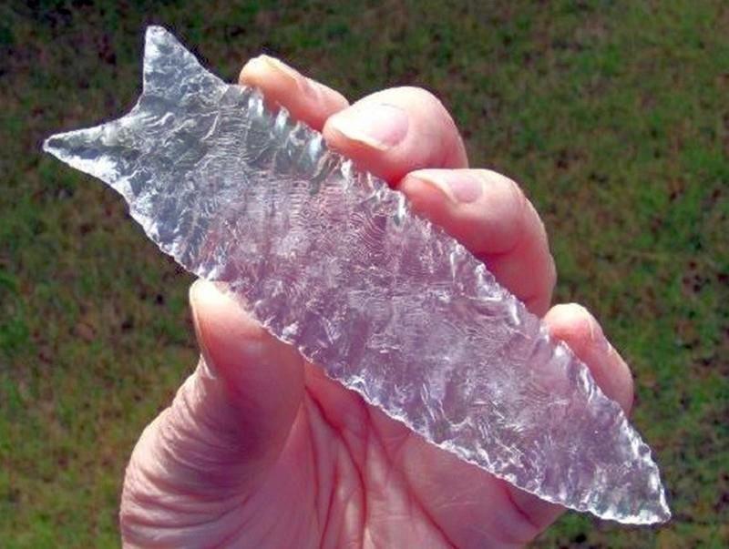 Это не единственный вариант стеклянных клинков с наконечниками. Вот изделия древних из другого природного стекла, из горного хрусталя: