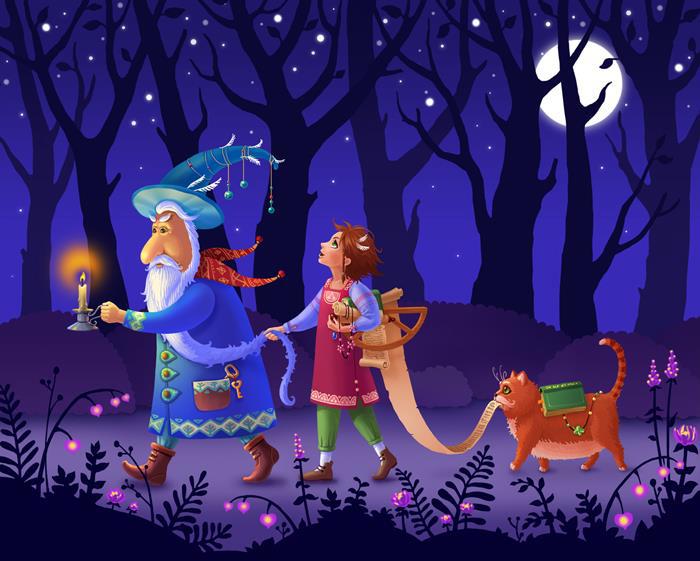 Октябрь 2014г. "Ночной поход". Волшебник, его ученица и кот идут по каким-то своим магическим делам. Просто красивая картинка для портфолио, потому что я решила завязать с компьютерными играми, переключиться на иллюстрации, и надо было с чего-то начать.
