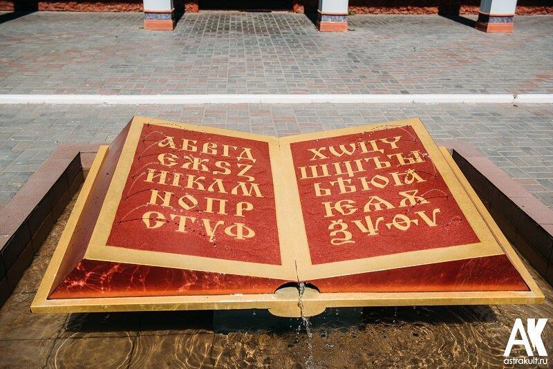 На развороте каменной книги написано приветствие. А "страницы" поливаются небольшим фонтанчиком - что-то наподобие имитации перелистывания книги.