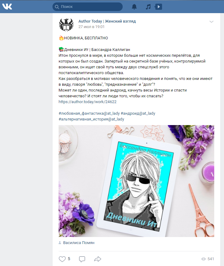 Автор: Бассандра КаллиганРешила я сделать опыт и предложила книгу в группу Author Today | Женский взгляд. Интересно стало - изменится ли что-то с просмотрами и временем чтения.