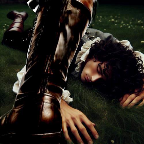 Пыталась украсить этот кадр издевательским сапогом на переднем плане, но ИИ заявил, что это запрещенный контент, садизм и издевательство (с чем я в принципе согласна, так и задумывалось), а сама я врисовала сапог, имхо, неудачно. Возможно, дело в разном ракурсе для сапога и для парня.