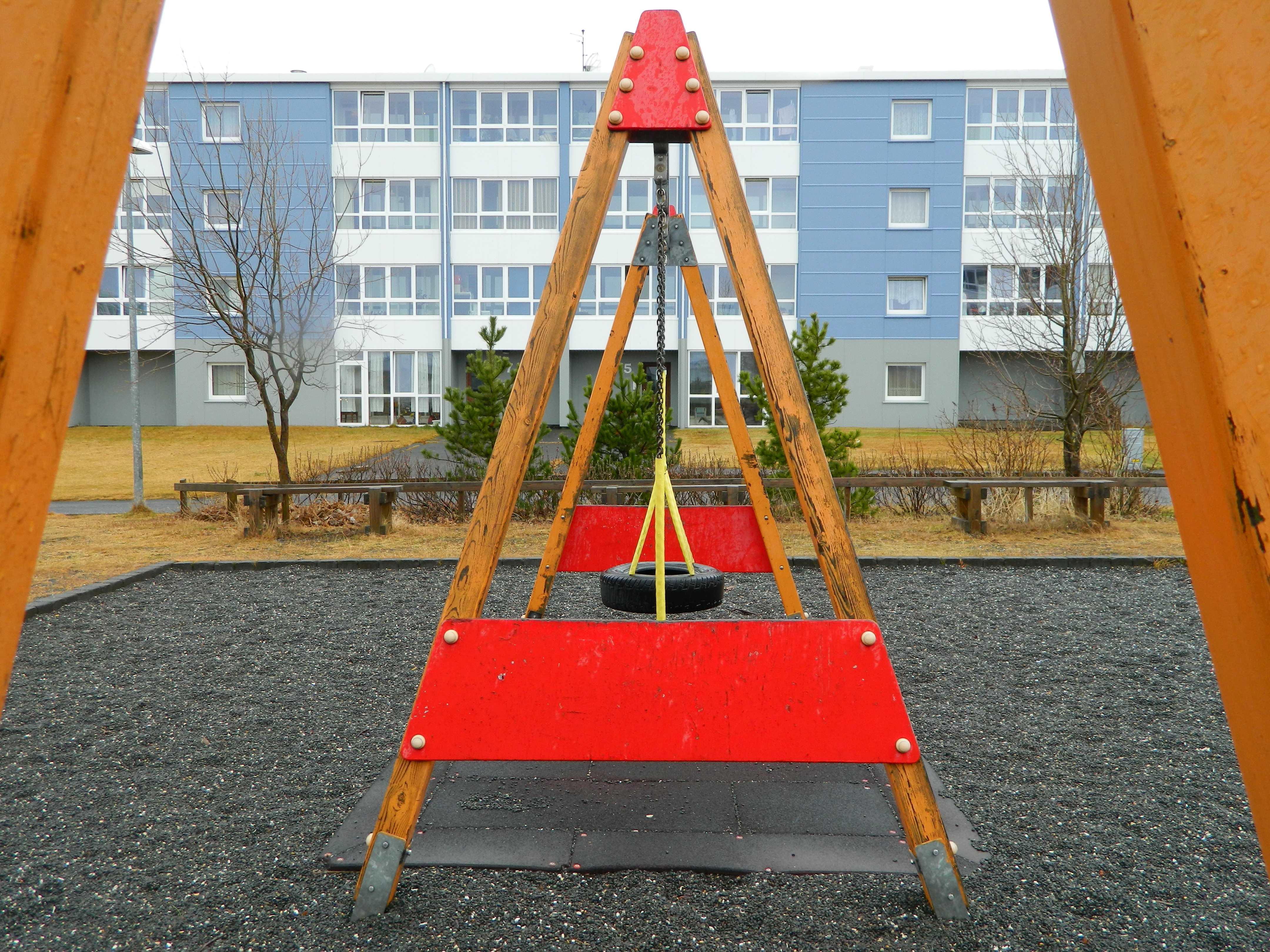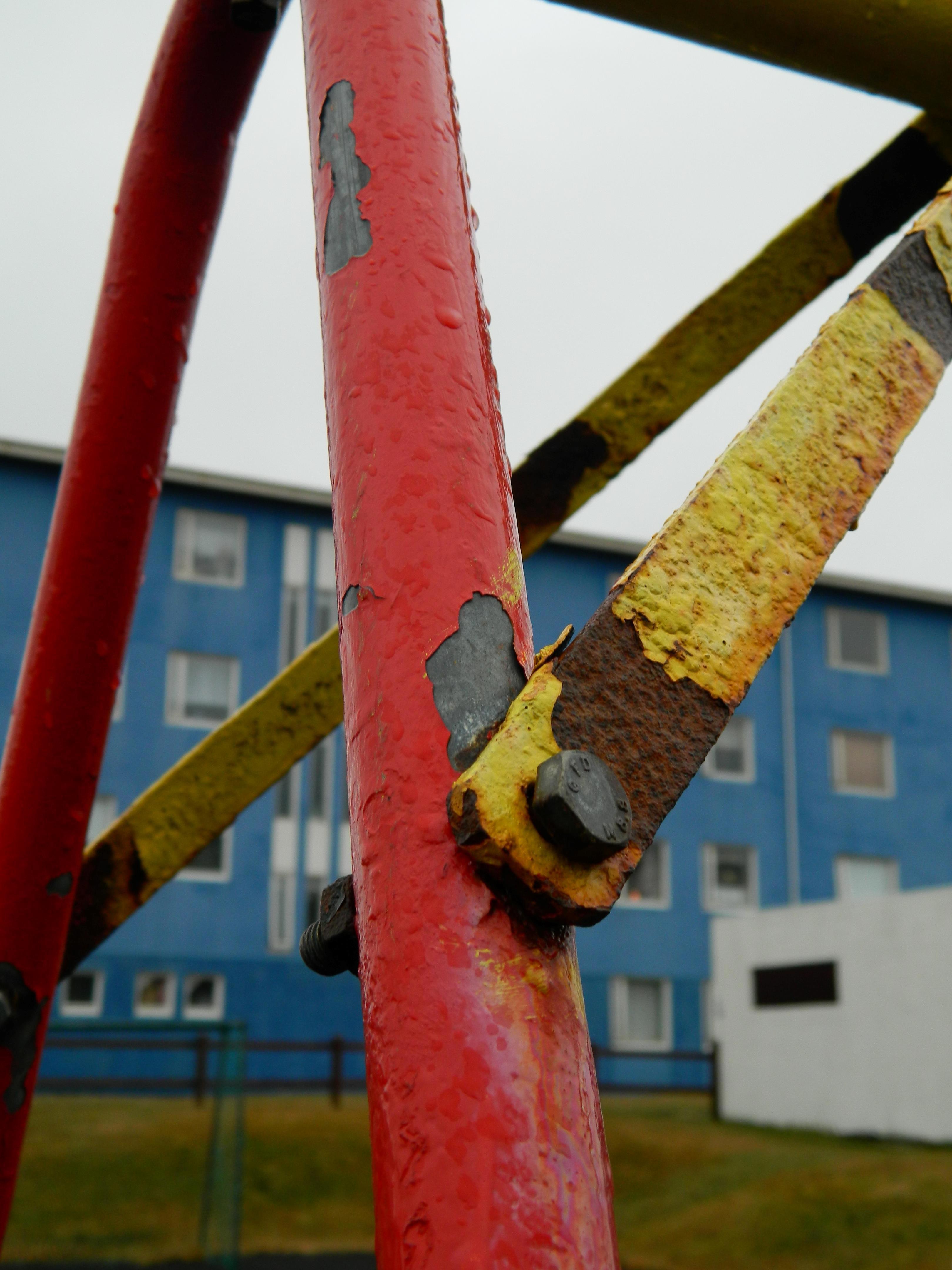 Серое уравновешивается рыжим пустырей и яркими пятнами крыш. Ну и тачек с качелями.