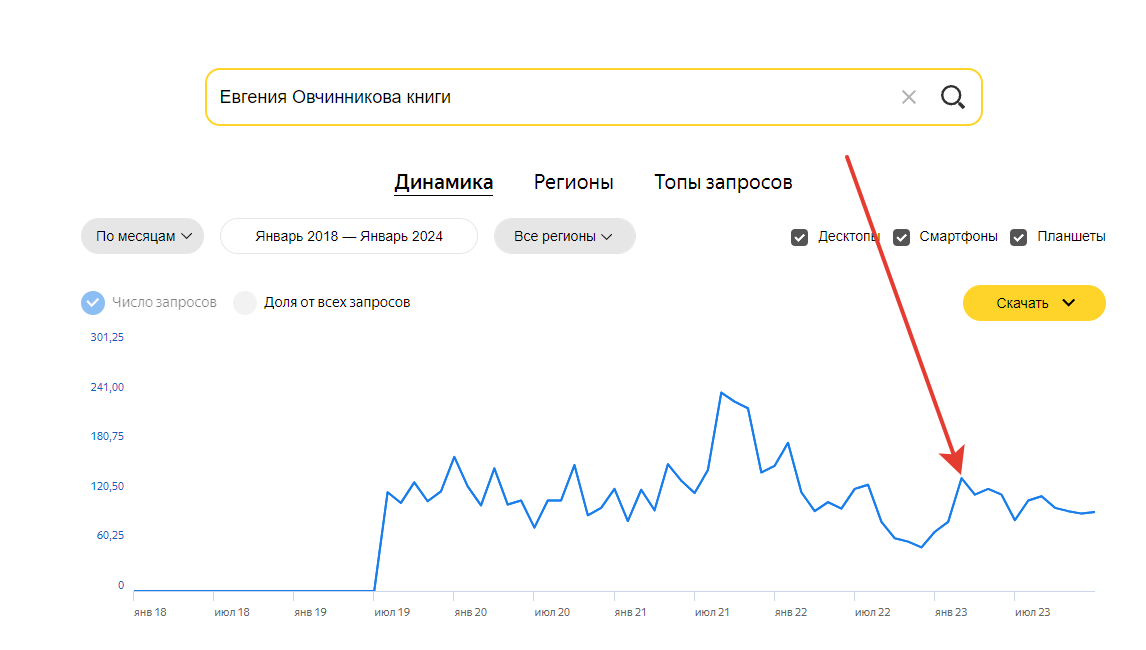 Март 2023 года. Евгения Овчинникова с книгой «Сквозь огонь» берет главный приз. «Имя+книги» - 137 запросов в победный месяц и 96 сейчас.