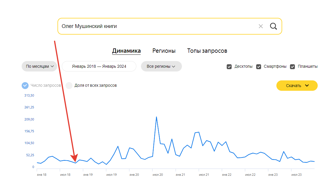 Ноябрь 2018 года. Олег Мушинский с книгой «Маяк Петра Великого» объявлен одним из победителей конкурса «Электронная буква». В победном месяце его книги (по запросу «Олег Мушинский книги») искали 24 раза в Яндексе (все цифры в статье взяты из сервиса Вордстат, который фиксирует статистику запросов в Яндексе). В январе 2024 это число увеличилось до 31 запроса.