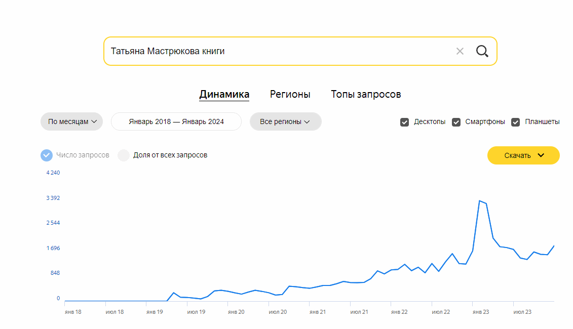 Нужно объяснять, что десятки запросов в поиске к успеху не имеют отношение? Обычно у успешных авторов их больше тысячи. Как например у Татьяны Мастрюковой, второй победительницы «Электронной буквы 2018», чье имя я пропустил. По графику запросов она стала успешной после победы в конкурсе. По запросу «имя+книги» она скакнула с 0 в победный месяц до 1874 в январе 2024! Но есть ли связь между победой в конкурсе и дальнейшим успехом? Олег Мушинский так же как и Мастрюкова победил в 2018-м, но успеха не добился.