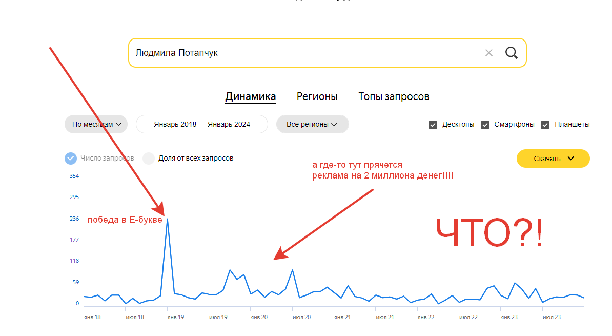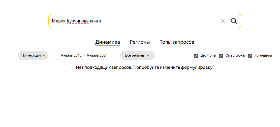 Декабрь 2019 года. Людмила Потапчук с книгой «Не обижайте Здыхлика» объявлена победительницей все того же конкурса. В победном месяце ее книги (по запросу «имя+книги») искали 0 раз. В январе 2024-го ситуация та же. Ситуация обостряется еще и тем, что Литрес потратил 2 000 000 денег на ее продвижение (это был приз за победу). Что?! Пришлось смотреть менее релевантный запрос «имя», который показал небольшой всплеск интереса (236 запросов, часть из которых не относится к писательнице) к человеку в победный месяц. Но влияние рекламы на запросы обнаружить практически не удалось.
