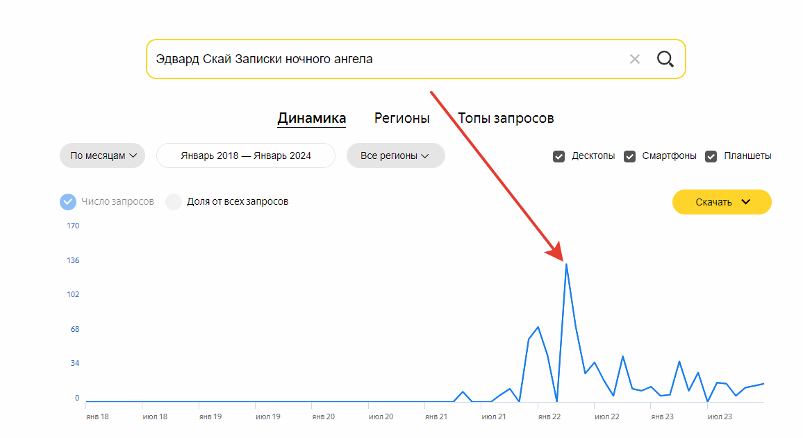 Апрель 2022 года. Эдвард Скай с книгой «Записки ночного ангела» побеждает в конкурсе. Запросов по «имя+книги» - 0, что тогда, что сейчас. А вот запросы «имя+название книги» такие: 136 в победный месяц и 8 сейчас.