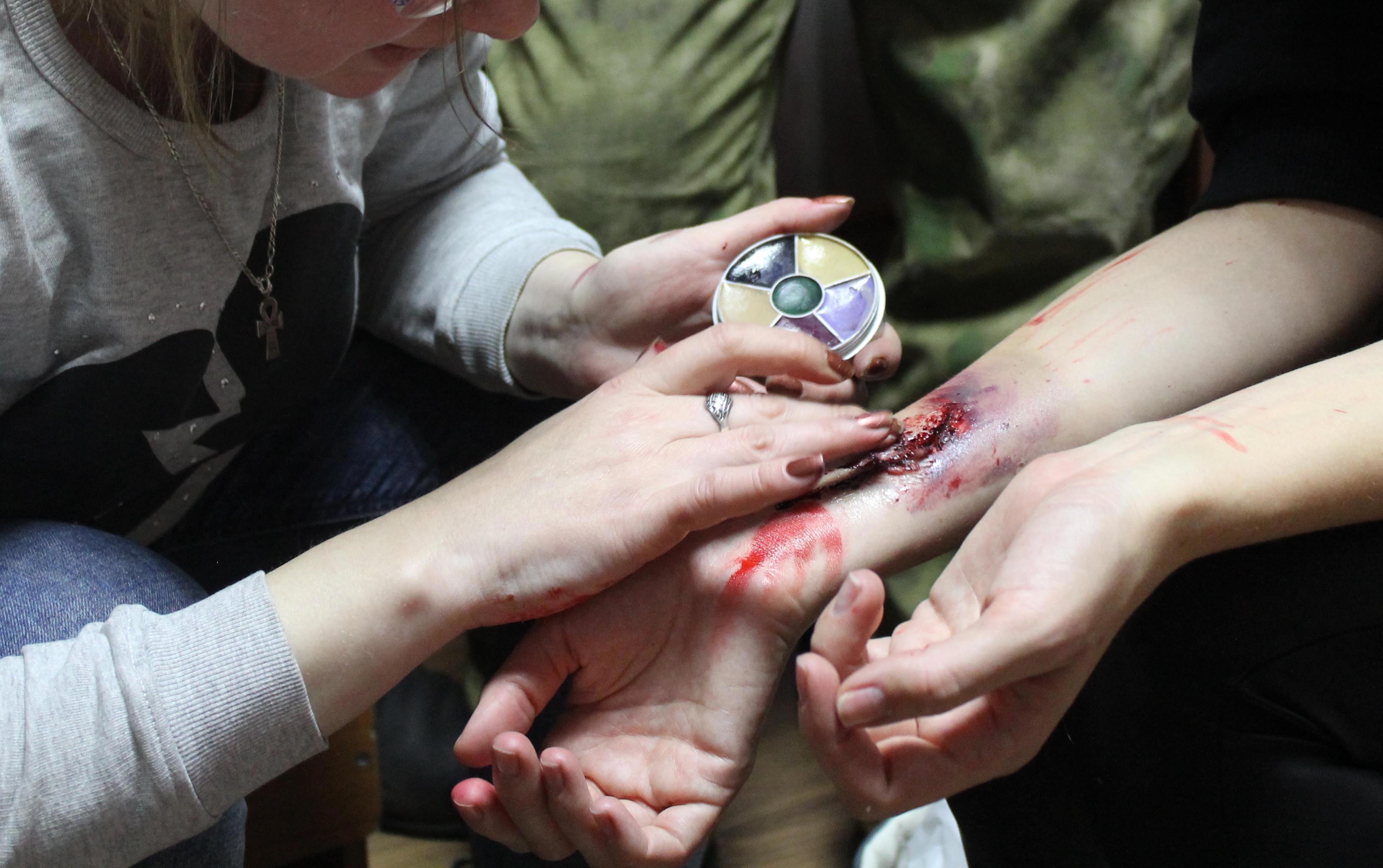 В общем, была с нами девушка, на вид - блондинка-блондинка, иначе не скажешь, хотя человек в реконструкции опытный. Короче, примерно за полчаса гримёр нарисовала ей на руке рваную рану. Причём такую, что на неё реально смотреть жутко - даже при том, что мы видели, как это рисовалось. Ну и кто-то из нас предлагает - а пошли в соседнюю комнату, там молодые студентки, которые реконят медиков - потроллим, истерики и обмороки посмотрим!