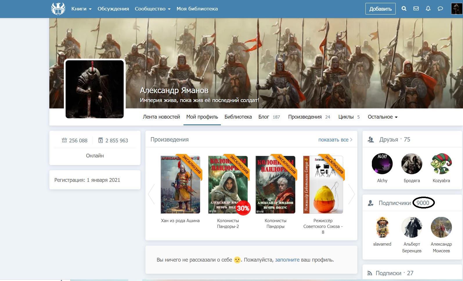 Автор: Александр ЯмановВсем привет. У меня событие - количество подписчиков уже 9000! Может, глупо радоваться подобному, типа хвастаюсь. Но это не так. Любой вменяемый автор понимает, что читатели - это его основное богатство. Поэтому хочу поблагодарить всех, кто читает мою графомань.) Обещаю вести себя хорошо (насколько это возможно) и радовать вас далее.